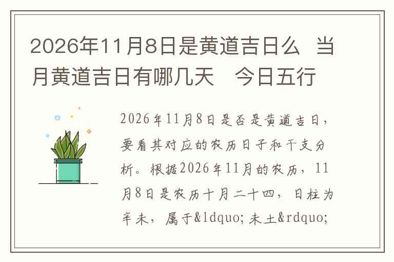 2026年11月8日是否是黄道吉日,要看其对应的农历日子和干支分析。根据2026年11月的农历,11月8日是农历十月二十四,日柱为辛未,属于“未土”。辛未日一般来说,在民间视为较为平和的日子,属于中性日,因此,若论传统意义上的黄道吉日,它可能并不被认为是极为吉利的日子。