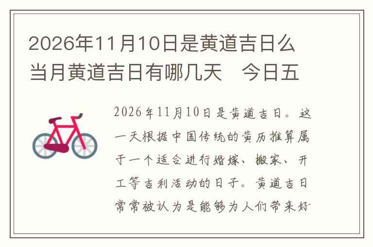 2026年11月10日是黄道吉日。这一天根据中国传统的黄历推算属于一个适合进行婚嫁、搬家、开工等吉利活动的日子。黄道吉日常常被认为是能够为人们带来好运、成功和顺利的日子,尤其是在选择重要活动的时机时,许多人倾向于参考这些日期。