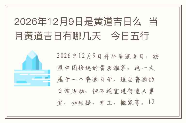 2026年12月9日并非黄道吉日,按照中国传统的黄历推算,这一天属于一个普通日子,适合普通的日常活动,但不适宜进行重大事宜,如结婚、开工、搬家等。