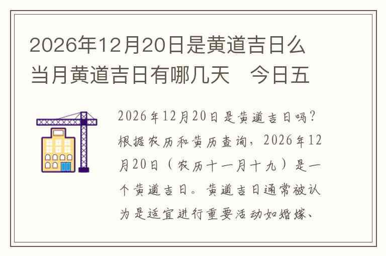 2026年12月20日是黄道吉日吗?根据农历和黄历查询,2026年12月20日(农历十一月十九)是一个黄道吉日。黄道吉日通常被认为是适宜进行重要活动如婚嫁、开业、搬家、旅行等的日子。根据传统的黄历,适合做一些有意义的事情,以带来好运和顺利。