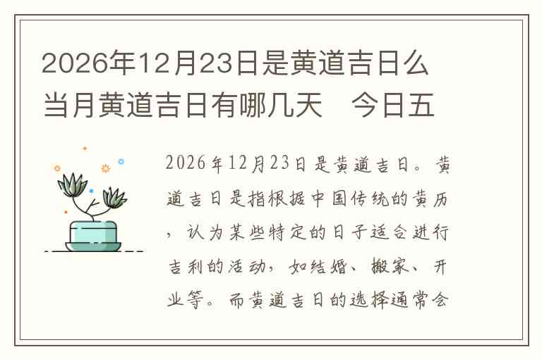 2026年12月23日是黄道吉日。黄道吉日是指根据中国传统的黄历,认为某些特定的日子适合进行吉利的活动,如结婚、搬家、开业等。而黄道吉日的选择通常会参考当日的天干地支、五行等因素,从而确定适宜的日期。