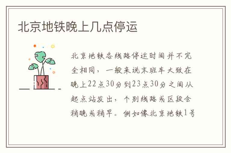 北京地铁各线路停运时间并不完全相同,一般来说末班车大致在晚上22点30分到23点30分之间从起点站发出,个别线路或区段会稍晚或稍早。