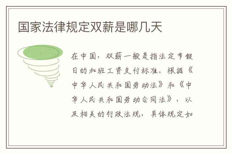 在中国,双薪一般是指法定节假日的加班工资支付标准。根据《中华人民共和国劳动法》和《中华人民共和国劳动合同法》,以及相关的行政法规,具体规定如下:
