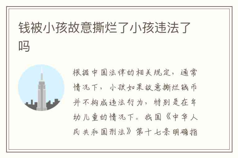 总结来说,小孩撕烂钱币本身并不违法,特别是未达到刑事责任年龄的情况下,但需要注意的是,家长或监护人应采取教育措施,避免类似行为的发生,并对可能的后果进行适当处理。