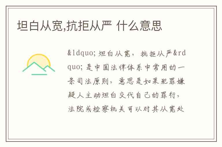 “坦白从宽,抗拒从严”是中国法律体系中常用的一条司法原则,意思是如果犯罪嫌疑人主动坦白交代自己的罪行,法院或检察机关可以对其从宽处理,给予较轻的刑罚。而如果嫌疑人坚决抗拒、否认犯罪事实,则会依法从严处理,可能会面临更重的刑罚。