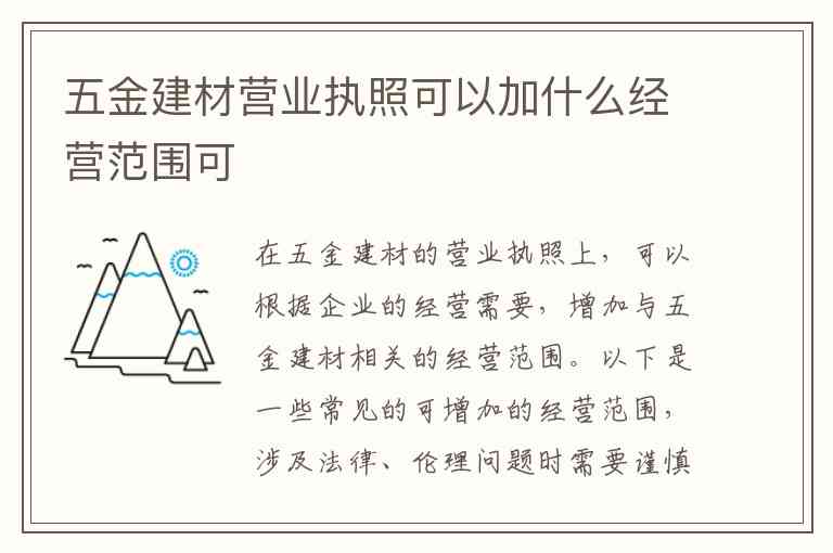 在五金建材的营业执照上,可以根据企业的经营需要,增加与五金建材相关的经营范围。以下是一些常见的可增加的经营范围,涉及法律、伦理问题时需要谨慎对待: