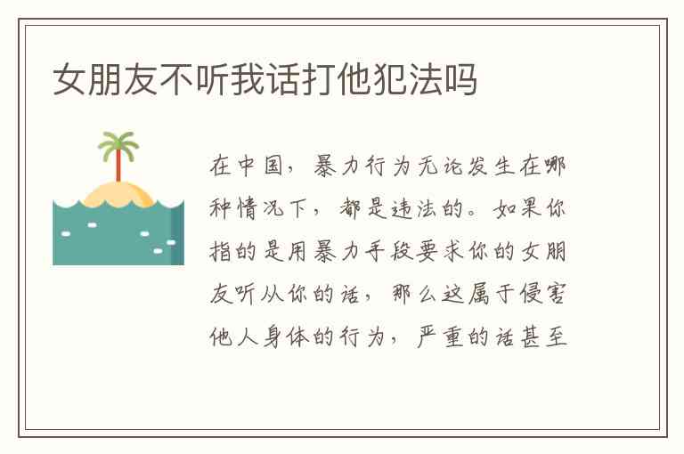 在中国,暴力行为无论发生在哪种情况下,都是违法的。如果你指的是用暴力手段要求你的女朋友听从你的话,那么这属于侵害他人身体的行为,严重的话甚至构成故意伤害罪。无论是在家庭、恋爱关系中还是其他私人关系里,任何形式的暴力行为都是不能接受的。