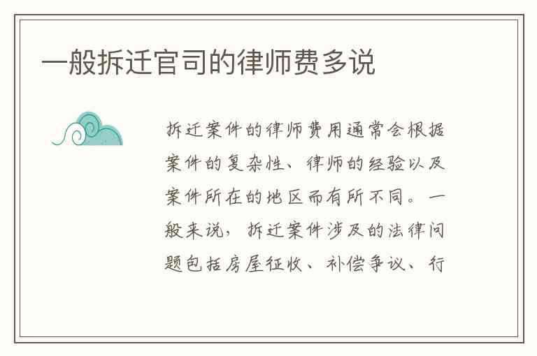按案件类型收费:一些律师事务所会根据案件的性质设置固定收费标准,拆迁案件通常属于复杂的行政诉讼案件,收费可能会较高,一般在几千元至几万元不等。