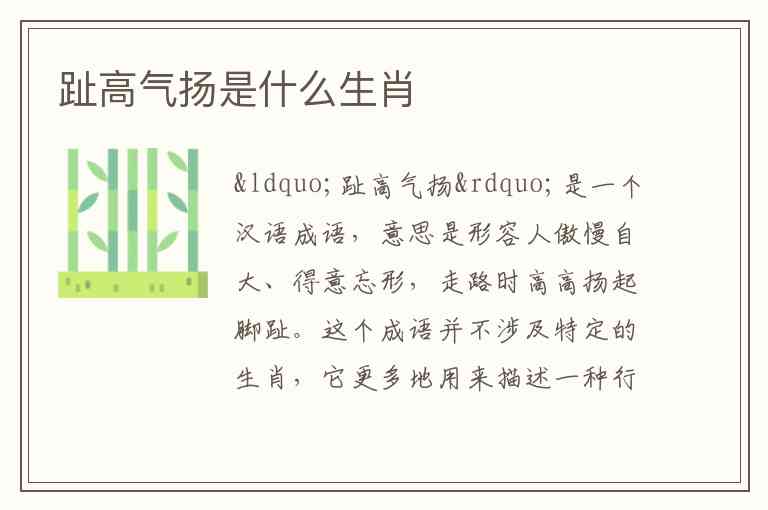 “趾高气扬”是一个汉语成语,意思是形容人傲慢自大、得意忘形,走路时高高扬起脚趾。这个成语并不涉及特定的生肖,它更多地用来描述一种行为态度或性格特征。生肖是与十二生肖相关的文化符号,用来代表年份、性格、命运等,而“趾高气扬”更多的是形容人的行为或气质。