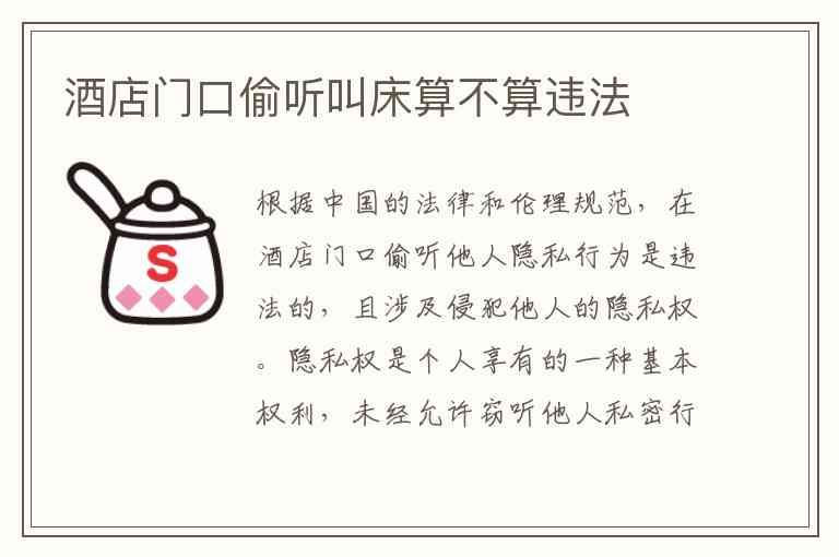 根据中国的法律和伦理规范,在酒店门口偷听他人隐私行为是违法的,且涉及侵犯他人的隐私权。隐私权是个人享有的一种基本权利,未经允许窃听他人私密行为属于对这一权利的侵犯。即便是在酒店这样的公共场所,个人的隐私仍然受到法律保护。