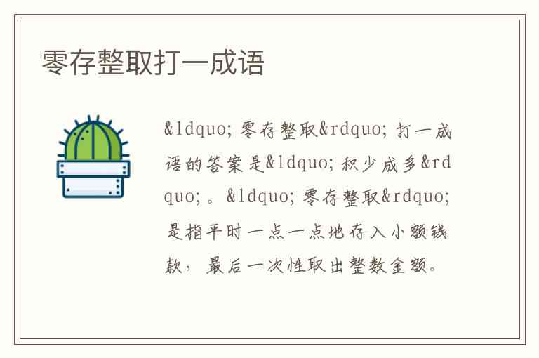 “零存整取”是指平时一点一点地存入小额钱款,最后一次性取出整数金额。这一过程体现了从少量逐渐积累,最终形成较多数量的特点,与“积少成多”意思相符,该成语就是表示积累少量的东西,最终汇聚成大量的。