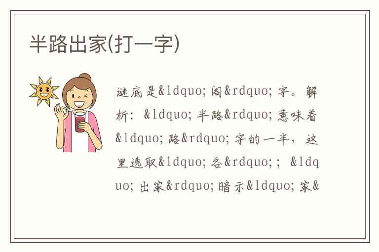 解析:“半路”意味着“路”字的一半,这里选取“各”;“出家”暗示“家”字出去一部分,取“门”。“门”与“各”组合起来就是“阁”字。