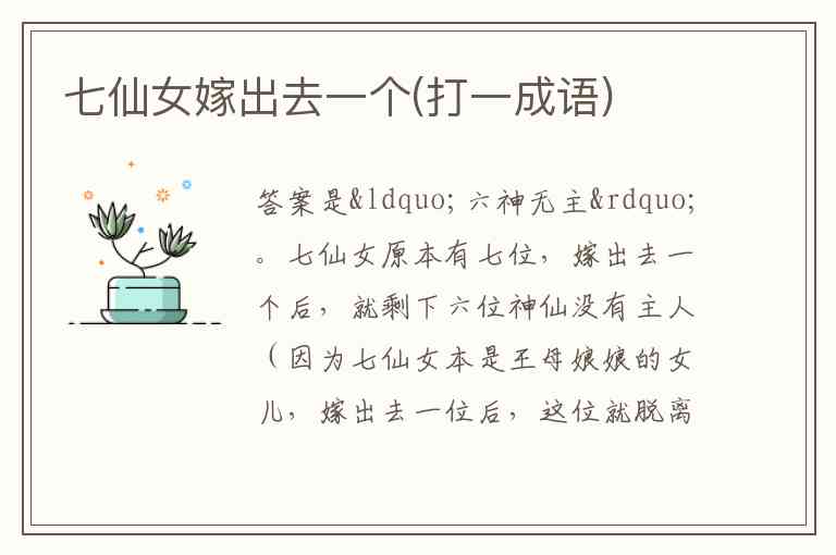 七仙女原本有七位,嫁出去一个后,就剩下六位神仙没有主人(因为七仙女本是王母娘娘的女儿,嫁出去一位后,这位就脱离了原来那种集体归属状态 ),所以对应成语“六神无主” 。