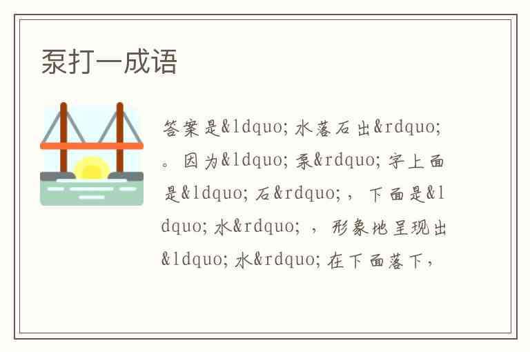 因为“泵”字上面是“石”,下面是“水” ,形象地呈现出“水”在下面落下,“石”在上面露出的样子,所以对应成语“水落石出”。