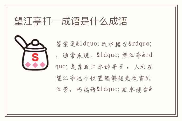 而成语“近水楼台”意思是水边的楼台先得到月光,比喻由于接近某些人或事物而抢先得到某种利益或便利,正好契合望江亭因靠近江水这一特点所具备的优势,所以谜底是“近水楼台” 。