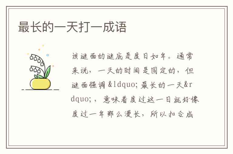 通常来说,一天的时间是固定的,但谜面强调 “最长的一天”,意味着度过这一日就好像度过一年那么漫长,所以扣合成语“度日如年” 。