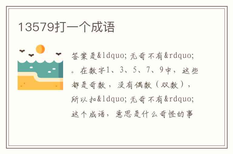 在数字1、3、5、7、9中,这些都是奇数 ,没有偶数(双数),所以扣“无奇不有”这个成语,意思是什么奇怪的事物都有。