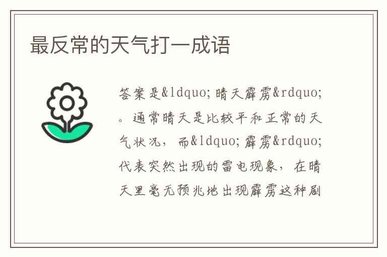 通常晴天是比较平和正常的天气状况,而“霹雳”代表突然出现的雷电现象,在晴天里毫无预兆地出现霹雳这种剧烈变化,完全打破常规天气模式,十分反常 ,所以用“晴天霹雳”形容最反常的天气很贴切。