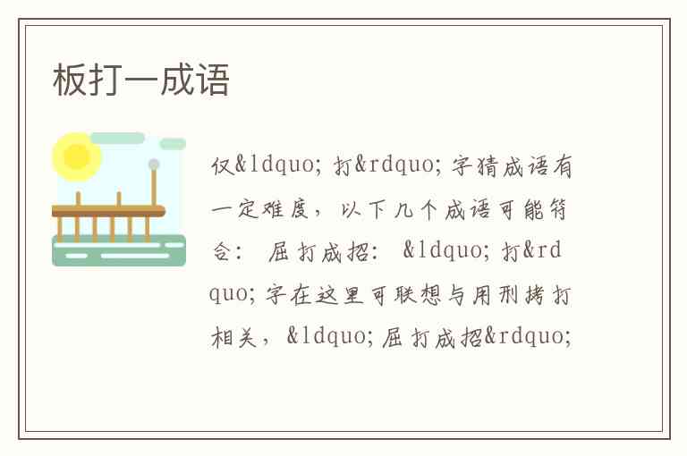 仅“打”字猜成语有一定难度,以下几个成语可能符合: 屈打成招: “打”字在这里可联想与用刑拷打相关,“屈打成招”意思是指无罪的人冤枉受刑,被迫招认有罪,其中包含了“打”的行为。