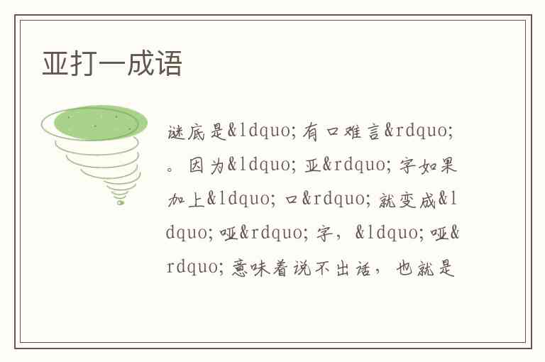 因为“亚”字如果加上“口”就变成“哑”字,“哑”意味着说不出话,也就是“难言”,所以对应成语“有口难言” 。