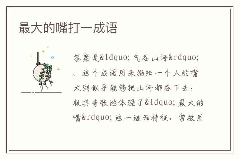 这个成语用来描绘一个人的嘴大到似乎能够把山河都吞下去,极其夸张地体现了“最大的嘴”这一谜面特征,常被用于形容气魄宏大 。