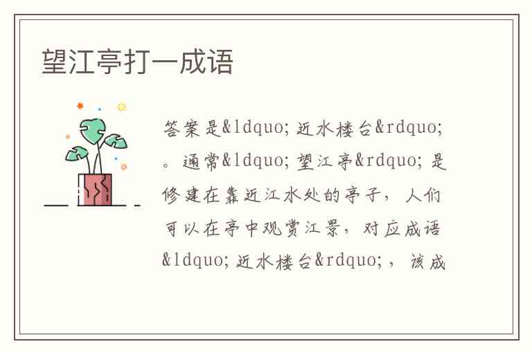 通常“望江亭”是修建在靠近江水处的亭子,人们可以在亭中观赏江景,对应成语“近水楼台”,该成语原指水边的楼台先得到月光,比喻由于接近某些人或事物而抢先得到某种利益或便利 。