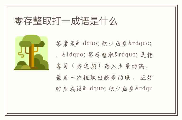 “零存整取”是指每月(或定期)存入少量的钱,最后一次性取出较多的钱 ,正好对应成语“积少成多”,意思是积累少量的东西,最终形成大量的积累。