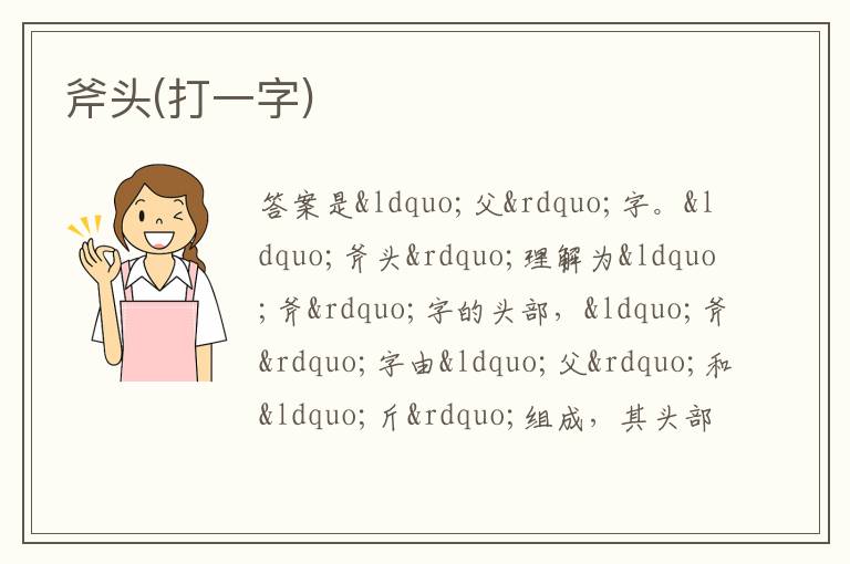 答案是“父”字。“斧头”理解为“斧”字的头部,“斧”字由“父”和“斤”组成,其头部就是“父”字。