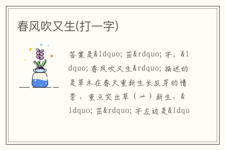 答案是“茁”字。“春风吹又生”描述的是草木在春天重新生长发芽的情景 ,重点突出草(艹)新生,“茁”字左边是“艹”,右边“出”有生长出来、冒出来之意,扣合谜面草木重生发芽的意思 。