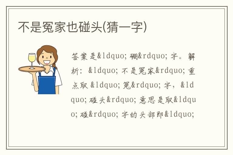 解析:“不是冤家”重点取 “冤”字,“碰头”意思是取“碰”字的头部即“石”。把“石”和“冤”组合起来,便得到“硼”字 。