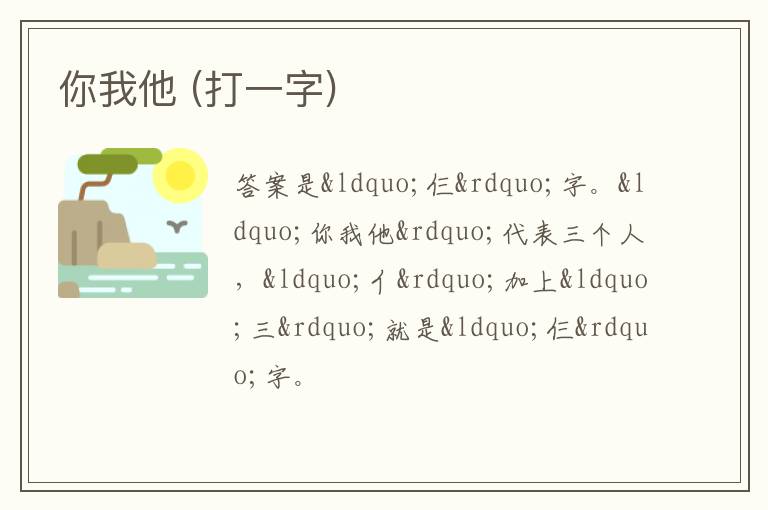 答案是“仨”字。“你我他”代表三个人,“亻”加上“三”就是“仨”字。