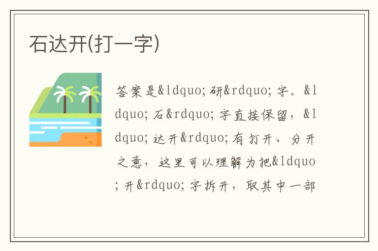 答案是“研”字。“石”字直接保留,“达开”有打开、分开之意,这里可以理解为把“开”字拆开,取其中一部分与“石”字组合,“开”字拆开后能与“石”组成字的部分就是“开”左边的“丆” ,“石”与“丆”组合成“研”字。