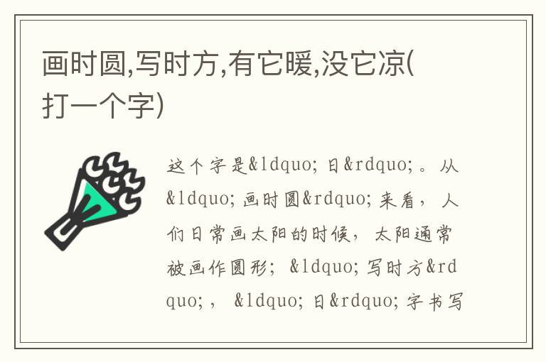 从“画时圆”来看,人们日常画太阳的时候,太阳通常被画作圆形;“写时方”, “日”字书写出来是方形结构;“有它暖,没它凉”,太阳(日)出来会带来温暖,没有太阳的时候天气就会比较凉爽 。所以综合判断这个谜底是“日”字。