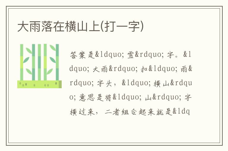 答案是“雪”字。“大雨”扣“雨”字头,“横山”意思是将“山”字横过来,二者组合起来就是“雪”字。