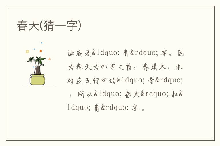 谜底是“青”字。因为春天为四季之首,春属木,木对应五行中的“青” ,所以“春天”扣“青”字 。