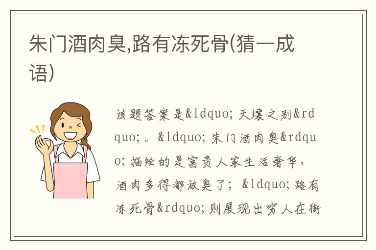 “朱门酒肉臭”描绘的是富贵人家生活奢华,酒肉多得都放臭了;“路有冻死骨”则展现出穷人在街头因饥寒交迫而死的悲惨景象。二者之间的差距极大,如同天和地之间的距离那样悬殊 ,所以用成语“天壤之别”来形容十分贴切。