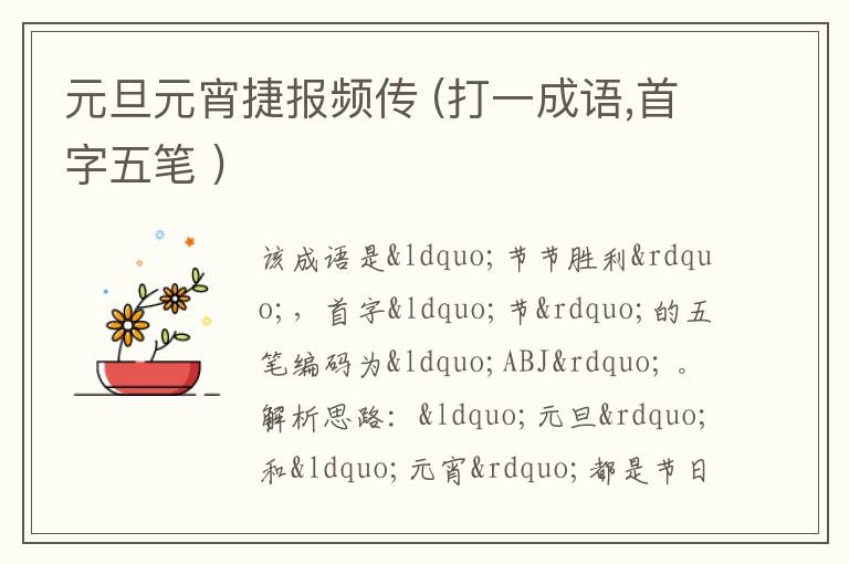 解析思路:“元旦”和“元宵”都是节日,这里用“节节”来指代;“捷报频传”意味着不断传来胜利的消息,所以扣“胜利”,整体得出成语“节节胜利” 。