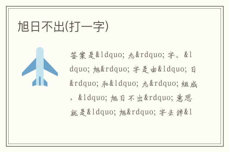 答案是“九”字。“旭”字是由“日”和“九”组成,“旭日不出”意思就是“旭”字去掉“日”,所以剩下“九”字。