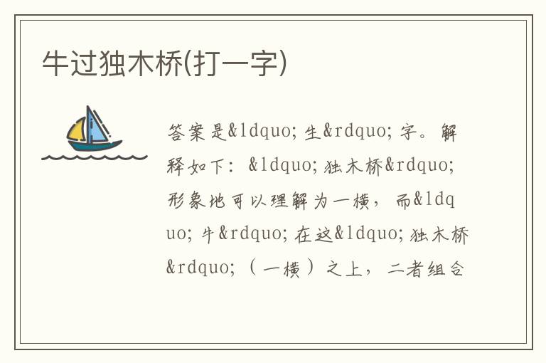答案是“生”字。解释如下:“独木桥”形象地可以理解为一横,而“牛”在这“独木桥”(一横)之上,二者组合起来就是“生”字。