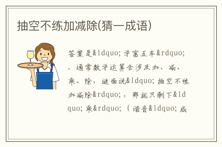 通常数学运算会涉及加、减、乘、除,谜面说“抽空不练加减除”,那就只剩下“乘”(谐音“成”)和“余”(可理解为剩下的部分)。“乘”与“车”相关,“余”可联想为丰富、多余等意思,整体扣“学富五车”这个成语 。