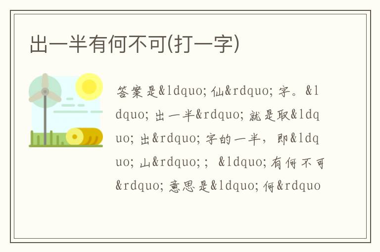 “出一半”就是取“出”字的一半,即“山”;“有何不可”意思是“何”字去掉“可”,剩下“亻”。 “亻”与“山”组合起来就是“仙”字。