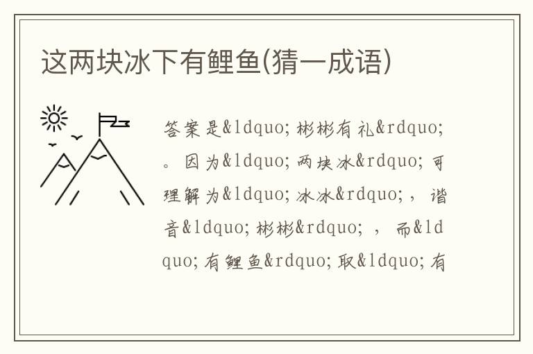 答案是“彬彬有礼”。因为“两块冰”可理解为“冰冰”,谐音“彬彬” ,而“有鲤鱼”取“有鲤”的谐音“有礼”,合起来就是成语“彬彬有礼”。