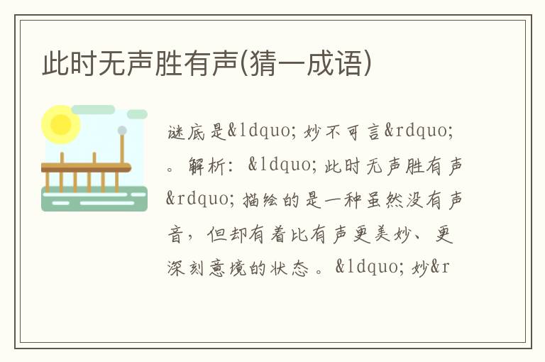 解析:“此时无声胜有声”描绘的是一种虽然没有声音,但却有着比有声更美妙、更深刻意境的状态 。“妙”体现出这种奇妙的情境,“不可言”表示无法用言语来表述,正对应此时无声却蕴含深意难以言说的感觉,所以是“妙不可言”这个成语。