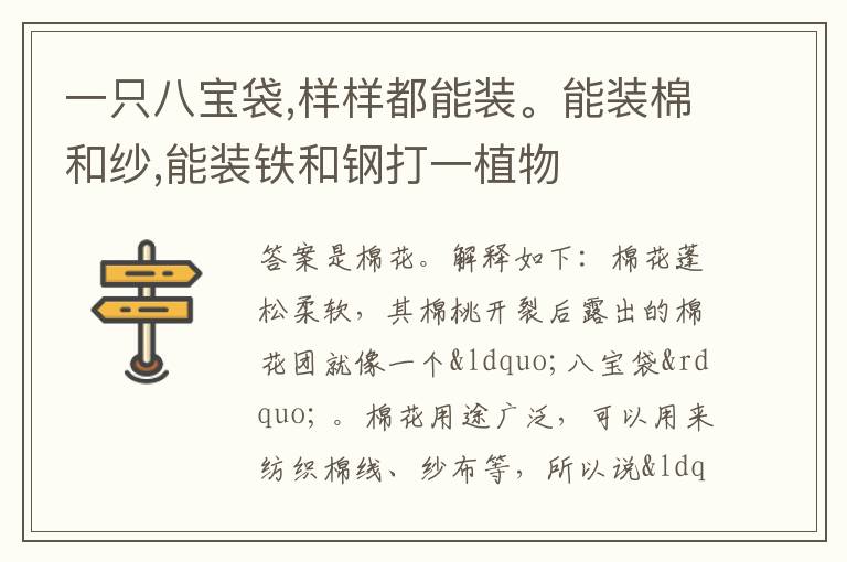 解释如下:棉花蓬松柔软,其棉桃开裂后露出的棉花团就像一个“八宝袋” 。棉花用途广泛,可以用来纺织棉线、纱布等,所以说“能装棉和纱”;同时,棉花常被用于包裹一些金属制品起到缓冲保护作用,仿佛把铁和钢“装”进去,因此符合谜面描述。