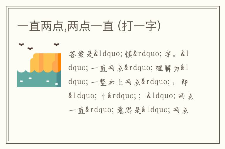 答案是“慎”字。“一直两点”理解为“一竖加上两点”,即“忄”;“两点一直”意思是“两点加上一竖”,可看作“真”字的上半部分,二者组合起来就是“慎”字。