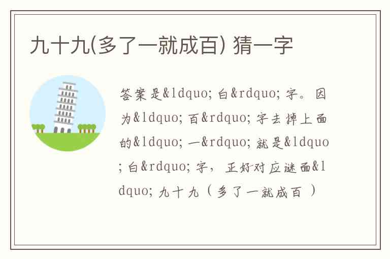 答案是“白”字。因为“百”字去掉上面的“一”就是“白”字,正好对应谜面“九十九(多了一就成百 )” 。