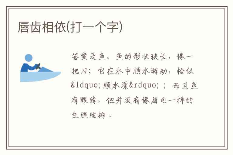 答案是鱼。鱼的形状狭长,像一把刀;它在水中顺水游动,恰似“顺水漂” ;而且鱼有眼睛,但并没有像眉毛一样的生理结构 。