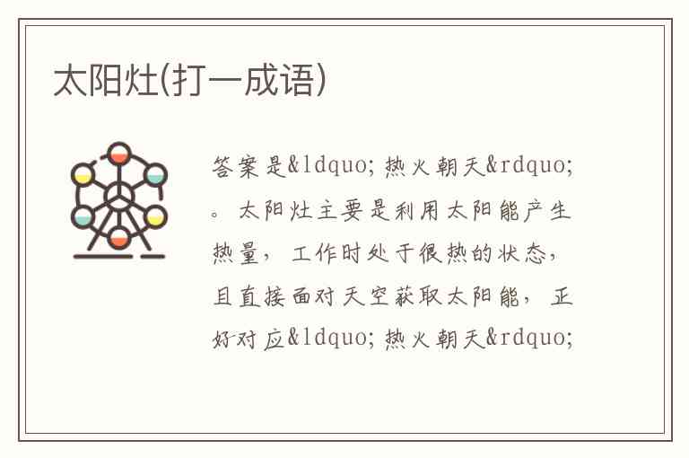 答案是“热火朝天”。太阳灶主要是利用太阳能产生热量,工作时处于很热的状态,且直接面对天空获取太阳能,正好对应“热火朝天”这个成语。