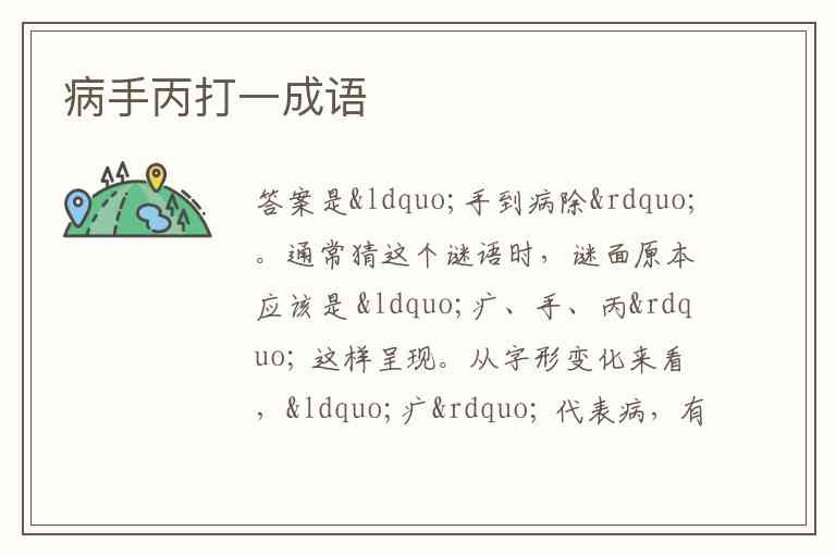 通常猜这个谜语时,谜面原本应该是 “疒、手、丙” 这样呈现。从字形变化来看,“疒” 代表病,有了 “手” 之后变成 “丙”,意味着 “病(疒)” 被去除了,所以扣合成语“手到病除” 。