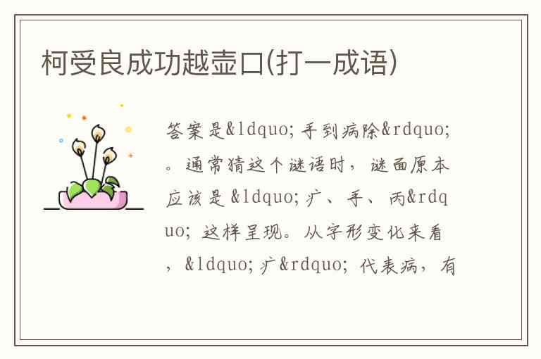 通常猜这个谜语时,谜面原本应该是 “疒、手、丙” 这样呈现。从字形变化来看,“疒” 代表病,有了 “手” 之后变成 “丙”,意味着 “病(疒)” 被去除了,所以扣合成语“手到病除” 。